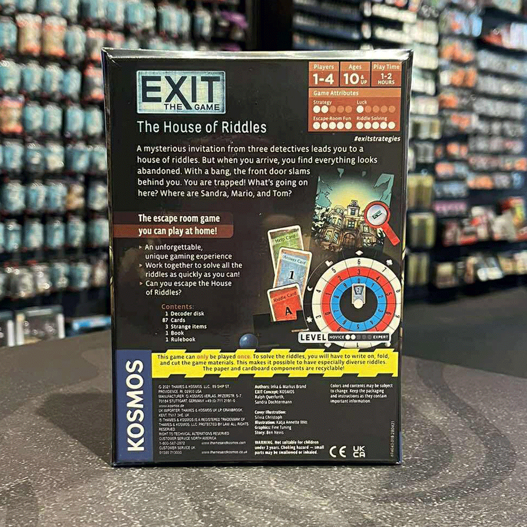 Exit the Game The House of Riddles is a puzzle game modeled after escape rooms, and it includes components meant to be folded, written upon, or torn, so it's marketed as a single-use game.