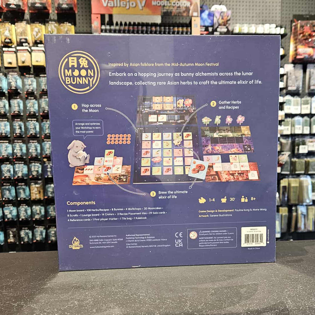 In Moon Bunny, you take on the role of a master bunny alchemist inspired by folklore. Your task is to guide your bunny assistants on a journey through the lunar landscape to gather rare Asian herbs. Each assistant has their own unique hopping movement pattern, and it is up to you to choose the right ones for the task at hand. Once you have collected the necessary ingredients, bring them back to your workshop and arrange them in a specific pattern to brew the ultimate elixir of life. The bunny who is able to gift this elixir to the world, bringing health and happiness to all, wins the game.