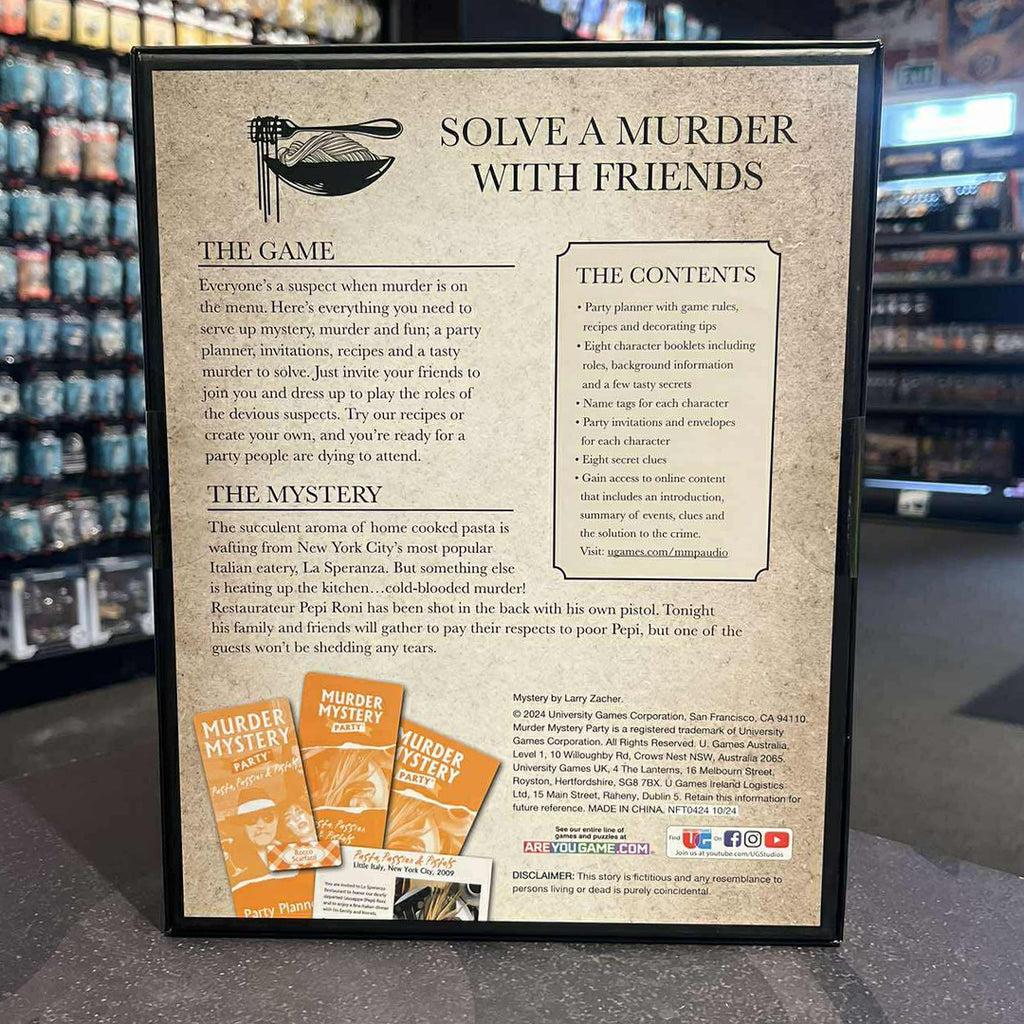 • Pasta, Passion and Pistols Murder Mystery Party Game is a dinner party in a box