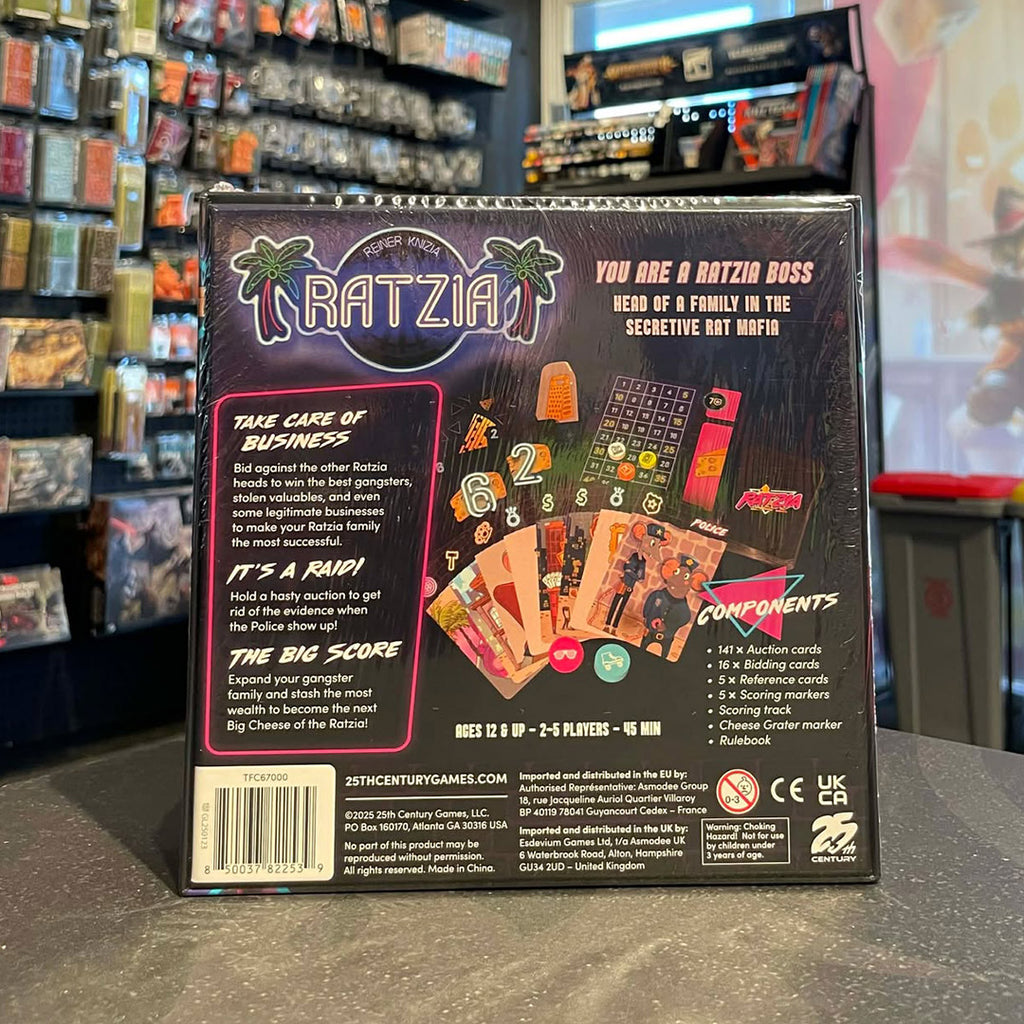 Ratzia! is a card game re-implementation of Knizia's earlier board game Ra with the only notable changes being the re-theme and lack of catastrophes.