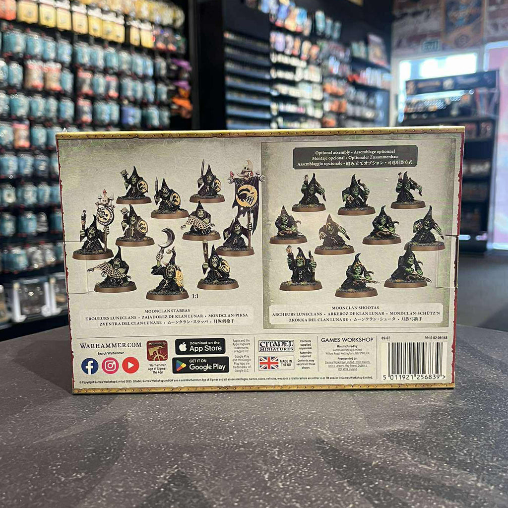 Inside the set, you’ll find enough stabbas, pokin’ spears and Moon Shields to build a unit of Stabbas, or enough Moonclan bows and slittas to build a unit of Shootas. You’ll also find a choice of Icon Bearers, a Gong Basher, 2 barbed nets and a special stabba for denoting the unit’s Moonclan Boss.