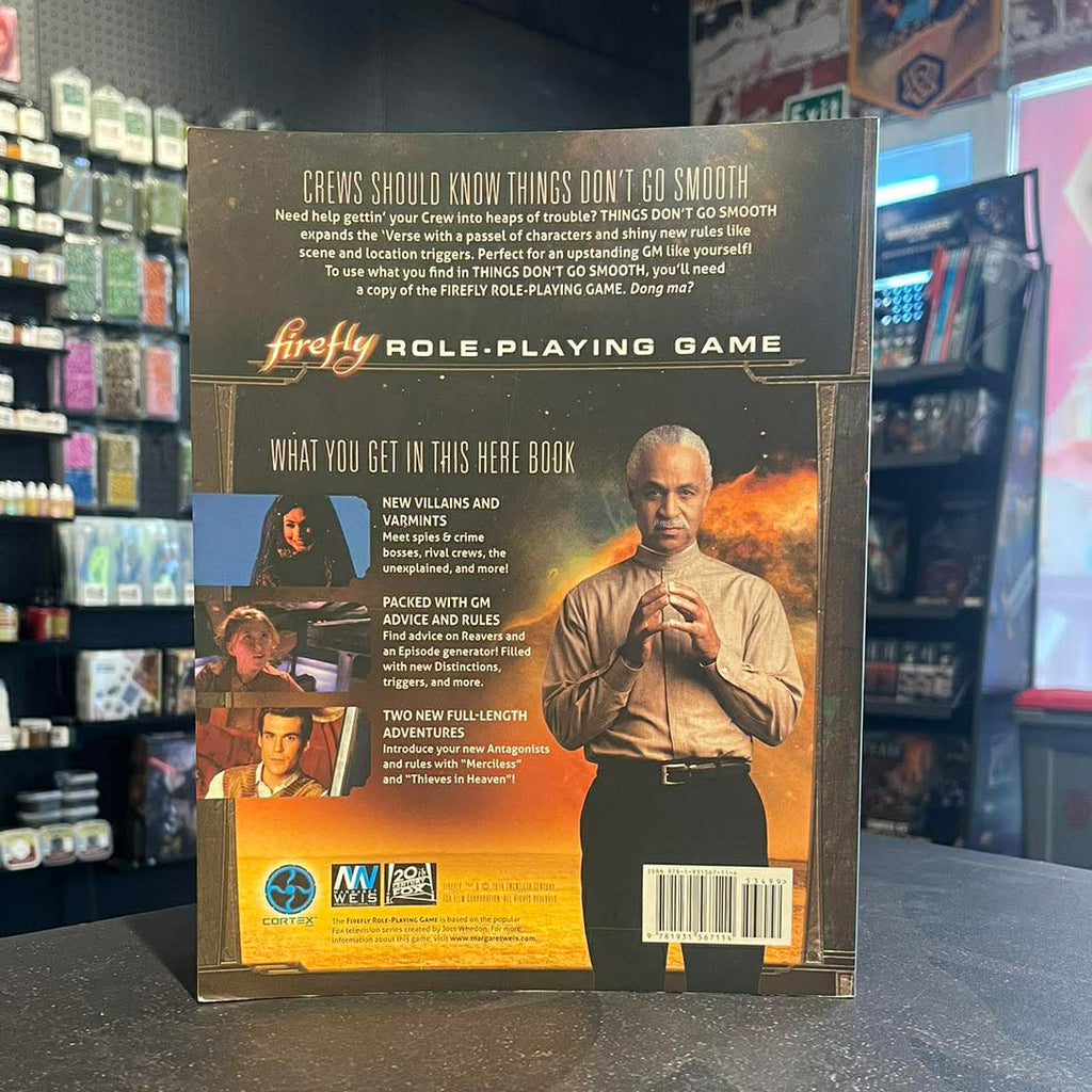 Life's not easy. Don't matter whether you're flying a leaky boat along the Rim or dodging Alliance cruisers in the Core, there's always something or somebody getting in the way of a Crew's honest day's work. THINGS DON'T GO SMOOTH presents a baker's dozen of shady crews, crime bosses, megalomaniacs, and unexplainable phenomena designed to get in the way of your Crew. Each includes a wealth of story hooks, supporting characters, locations, ships, and background material to help you bring the ‘Verse to your table. GM's will also find over 50 new Distinctions and Signature Assets, new enemy boats, rules for scene Traits and triggers, plus the Episodes “Merciless” and “Thieves in Heaven” to bring these characters to life!