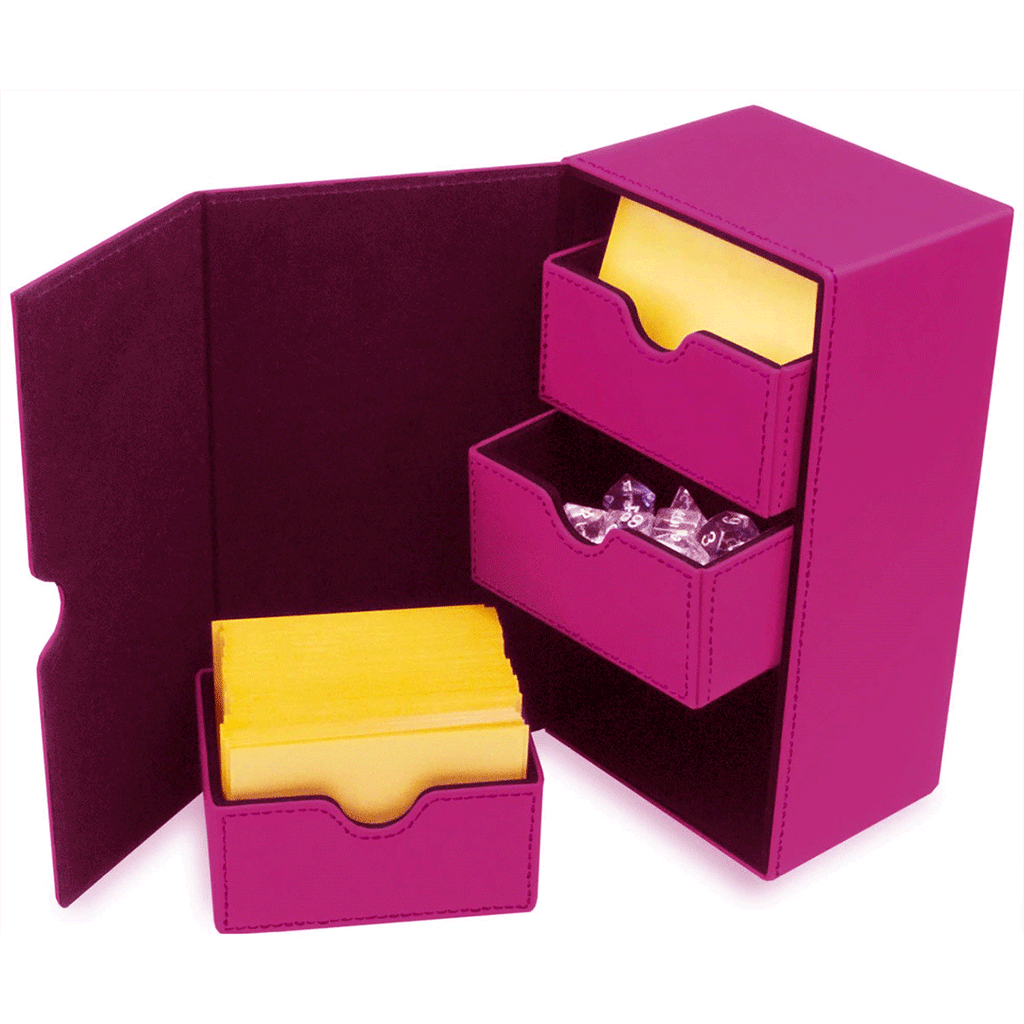 Expand your battle potential with the BCW Deck Vault-LX 200! Perfect for on-the-go gaming at cons, tournaments, or any unscheduled throw down. It’s made with a durable faux leather outer shell and microfiber faux-suede interior. It can carry two double-sleeved, 100-card decks in addition to all the dice, tokens, and bits you might need. There’s so much additional space you can actually carry an extra 75 sleeved cards instead. Just about every card game fits in the Deck Vault-200. It is especially useful for Magic Commander/EDH, but can also accommodate Pokemon, Yu Gi Oh, Dragonball, Force of Will, and many others. It not only works well with cards but also dice-based games like Dicemasters and Star Wars Destiny. Holds over 200 double-sleeved gaming cards. Durable, black cover with red stitching. Flip-open panel with strong magnetic closure. 2 removable inner deck trays and dice tray.