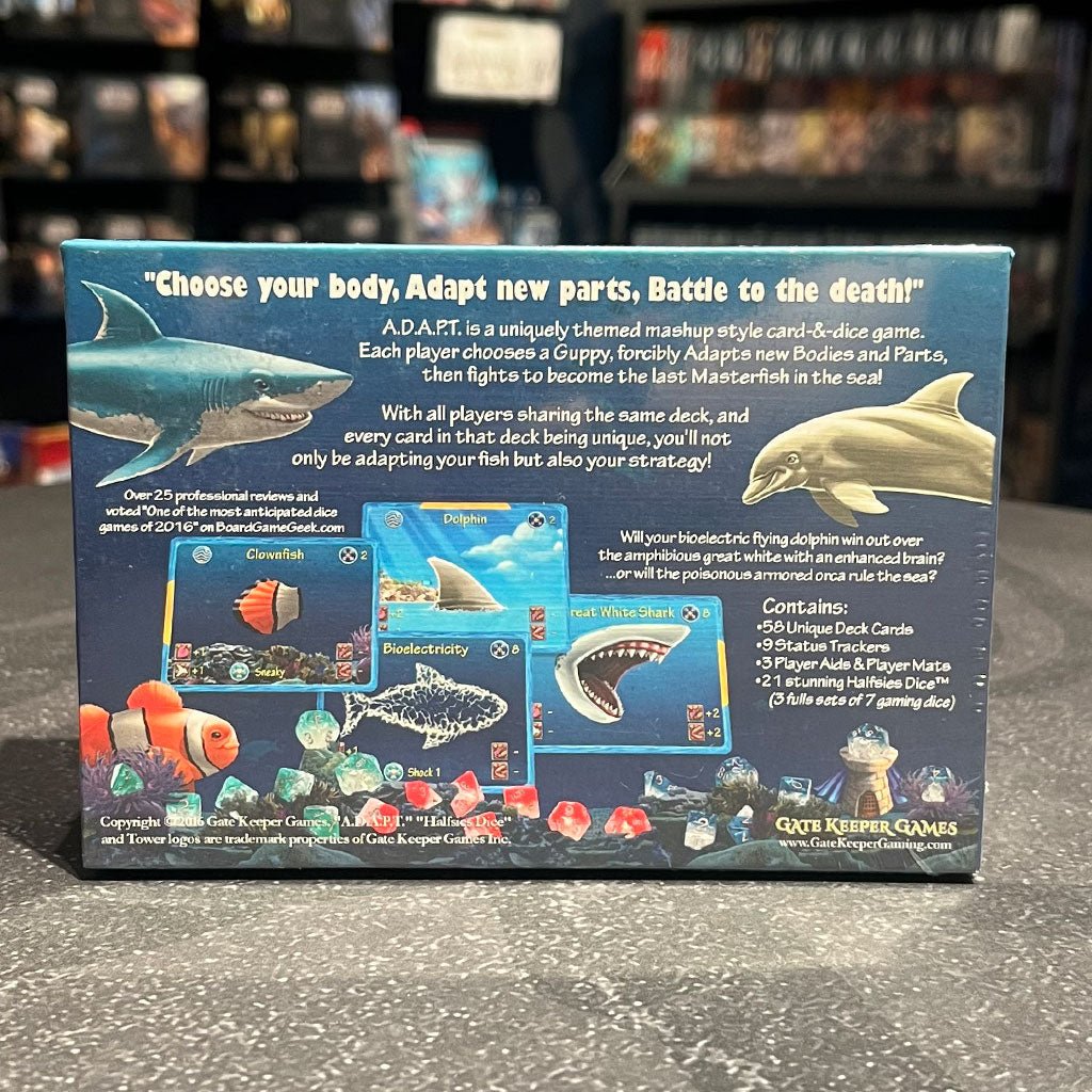 A.D.A.P.T. is a card game for 2-3 players that usually plays in 20-30 minutes, comes with three full sets of polyhedral dice (3d4s, 3d6s, 3d8s, 6d10s, 3d12s, & 3d20s), and proudly bears a very unique theme. Lightweight, light hearted, and entirely unique — we're certain you've never played anything like it before.