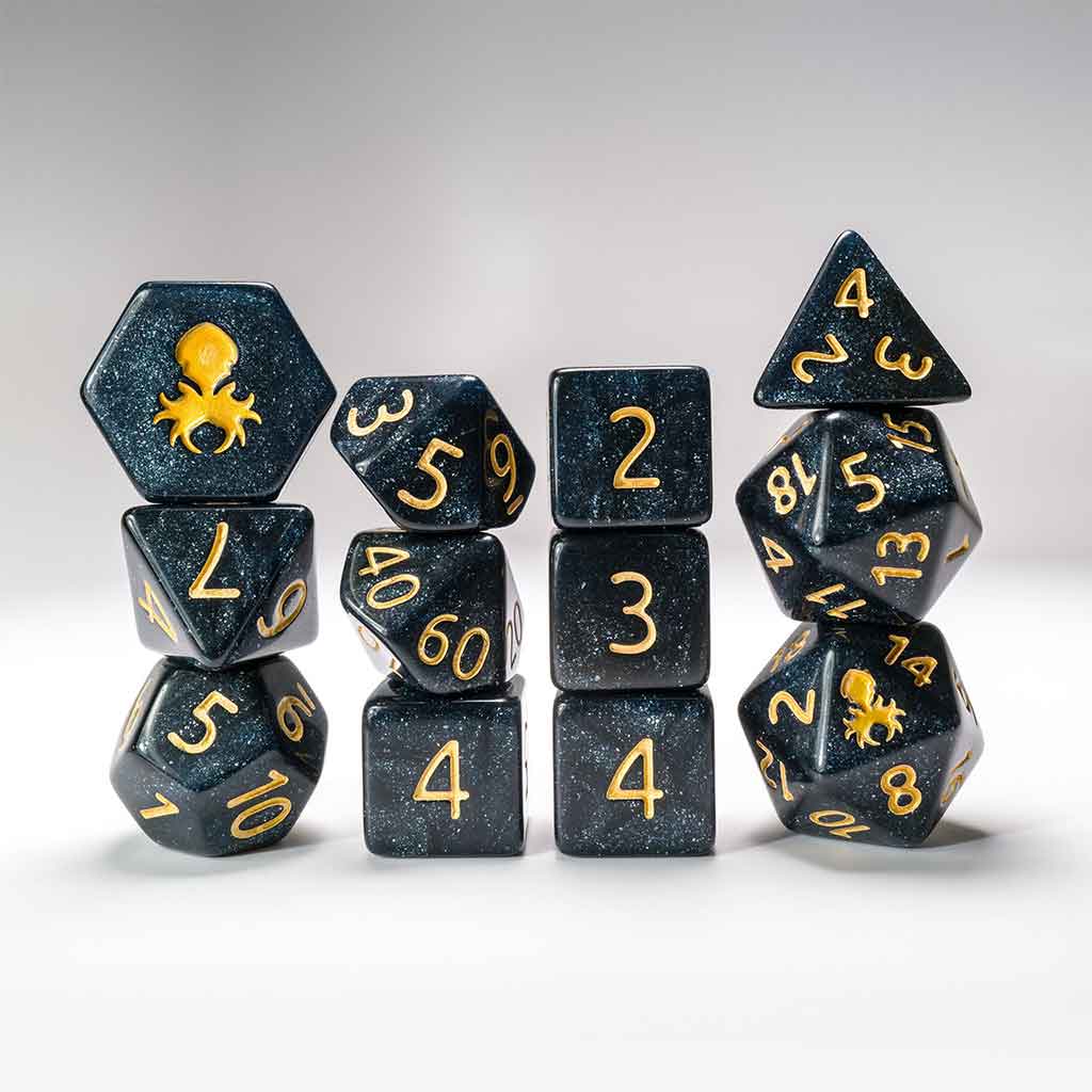 Abyss 12 Piece Glimmer Dice Set with Gold Ink + Dice Bag (Kraken Dice)