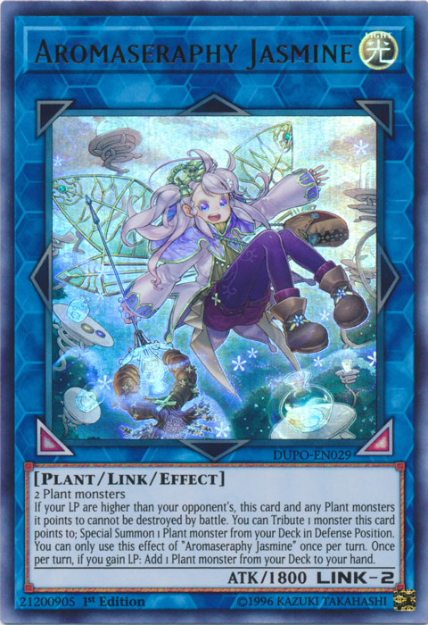 2 Plant monsters If your LP are higher than your opponent's, this card and any Plant monsters it points to cannot be destroyed by battle. You can Tribute 1 monster this card points to; Special Summon 1 Plant monster from your Deck in Defense Position. You can only use this effect of "Aromaseraphy Jasmine" once per turn. Once per turn, if you gain LP: Add 1 Plant monster from your Deck to your hand.