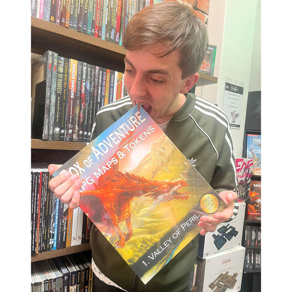 Loke Battle Mats’ Box of Adventure – Valley of Peril – is the system agnostic kit you have been waiting for. It combines modular maps and tokens of monsters, baddies and NPCs, everything you need to run any fantasy RPG. There are also terrain tokens and building tokens. As a result you can customise the maps and build your encounter areas however you want them.