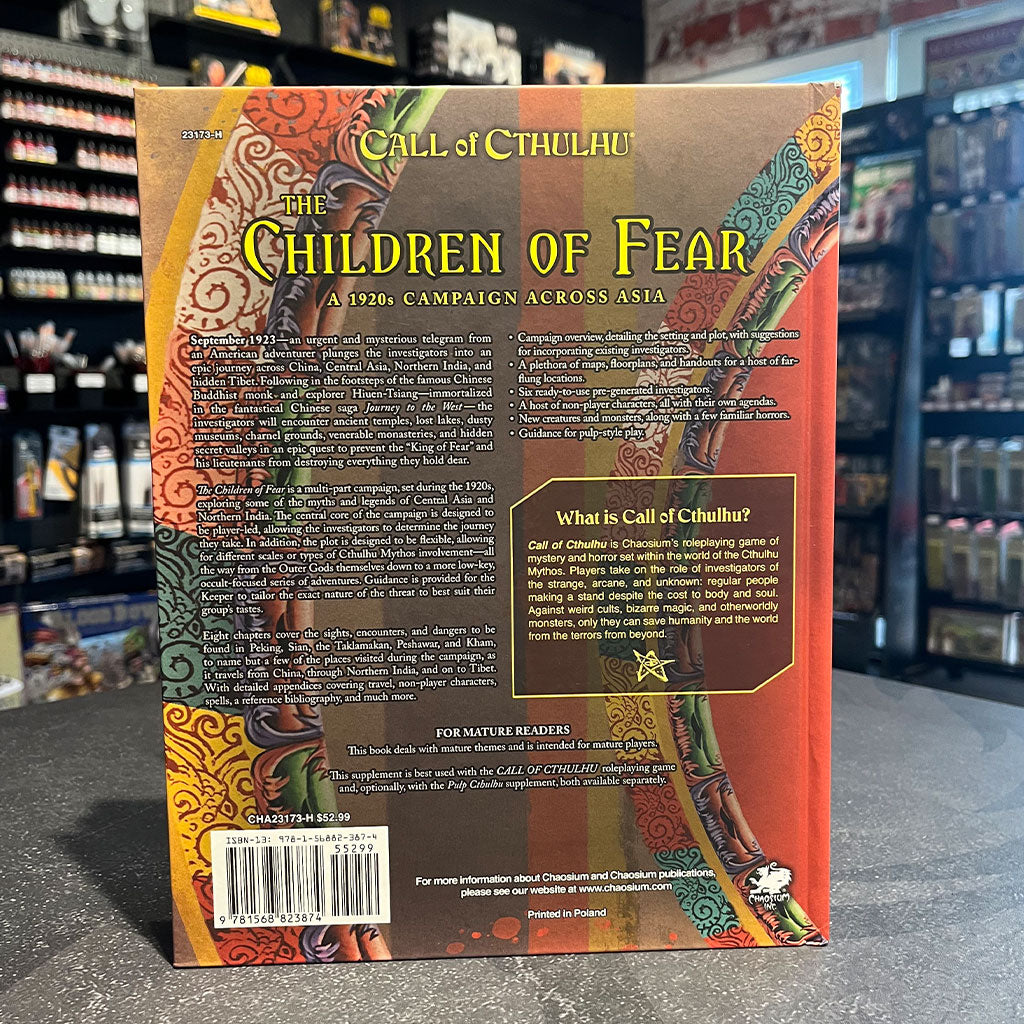 The Children of Fear is a multi-part campaign, set during the 1920s, exploring some of the myths and legends of Central Asia and Northern India. The central core of the campaign is designed to be player-led, allowing the investigators to determine the journey they take. In addition, the plot is designed to be flexible, allowing for different scales or types of Cthulhu Mythos involvement—all the way from the Outer Gods themselves down to a more low-key, occult-focused series of adventures. Guidance is provided for the Keeper to tailor the exact nature of the threat to best suit their group's tastes.