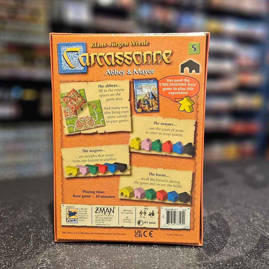 Carcassonne: Expansion 5 – Abbey & Mayor introduces fresh strategies for expanding your influence in the game. In this expansion, traveling merchants display their goods in cities and abbeys, while some cities have appointed mayors to lead them. Farmers grow wealthier by skillfully marking their territories, and the Church seeks to bolster its power by constructing grand abbeys. Each tile in this expansion is marked with a unique icon for easier sorting and organization, adding new layers of depth to your Carcassonne experience.
