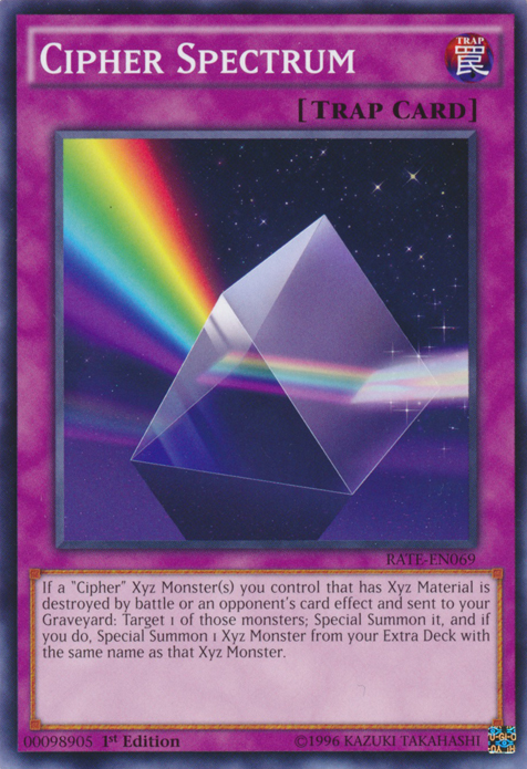If a "Cipher" Xyz Monster(s) you control that has Xyz Material is destroyed by battle or an opponent's card effect and sent to your Graveyard: Target 1 of those monsters; Special Summon it, and if you do, Special Summon 1 Xyz Monster from your Extra Deck with the same name as that Xyz monster.