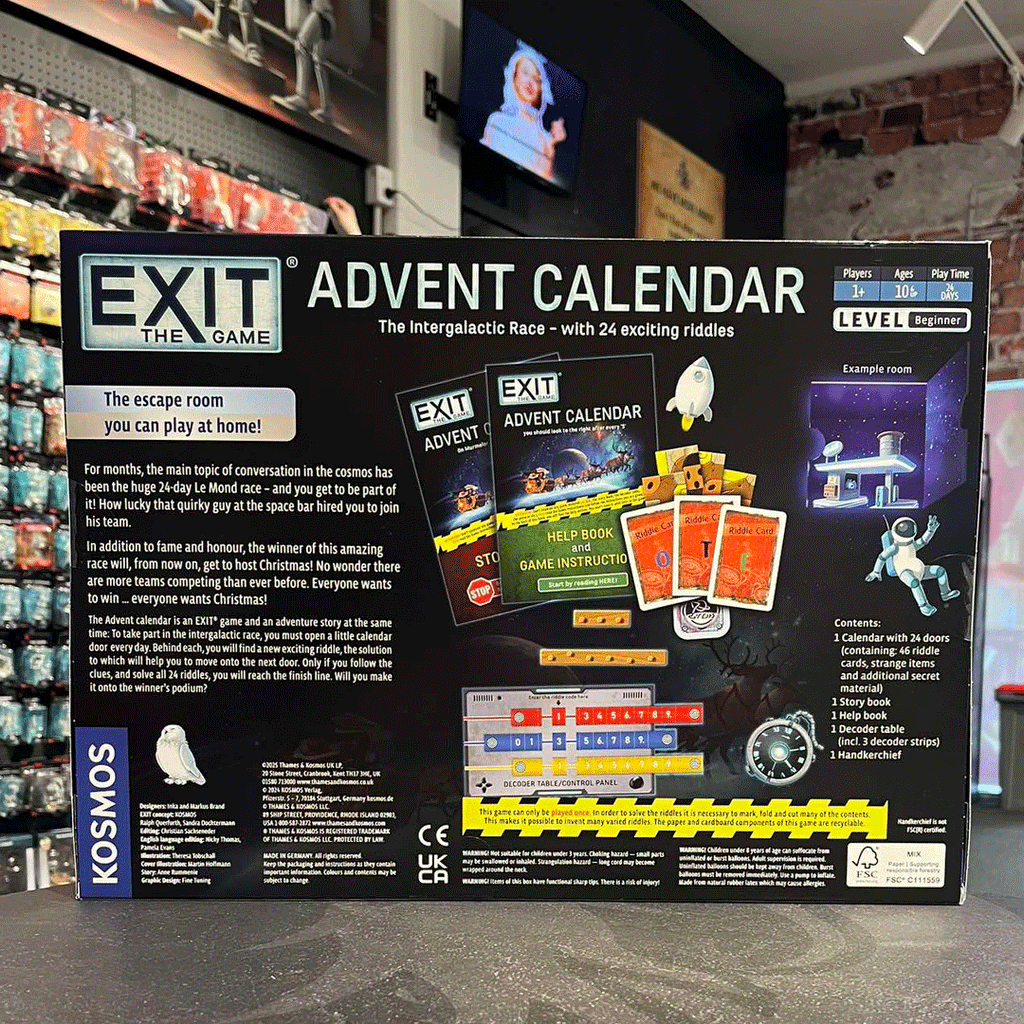 The Advent calendar is an EXIT® game and an adventure story in one: To take part in the intergalactic race, you must open a little calendar door every day. Behind each, you will find a new exciting riddle, the solution to which will help you move on to the next room. Only if you follow the clues, and solve all 24 riddles, will you make it onto the winner’s podium!