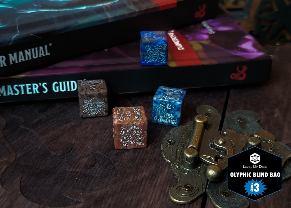 Introducing Limited Edition Handcrafted Gemstone Dice - Box of 12 Blind Bags (Series 3) by Level Up Dice: The ultimate treasure for every avid gamer! Step into a world of enchantment and excitement with Level Up Dice's Glyphic Blind Bag Series 3, featuring an unparalleled collection of mind-blowing dice.